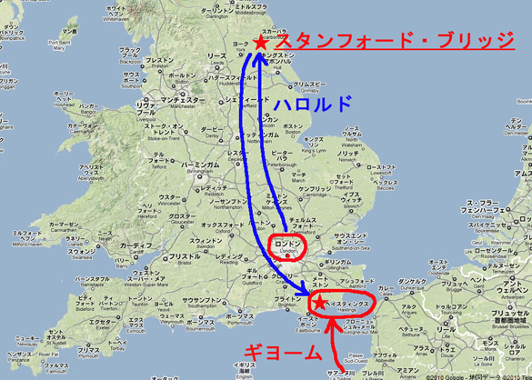 青はハロルドの動き。フランスからは海を渡ってノルマンディー公ギヨームがやって来る。